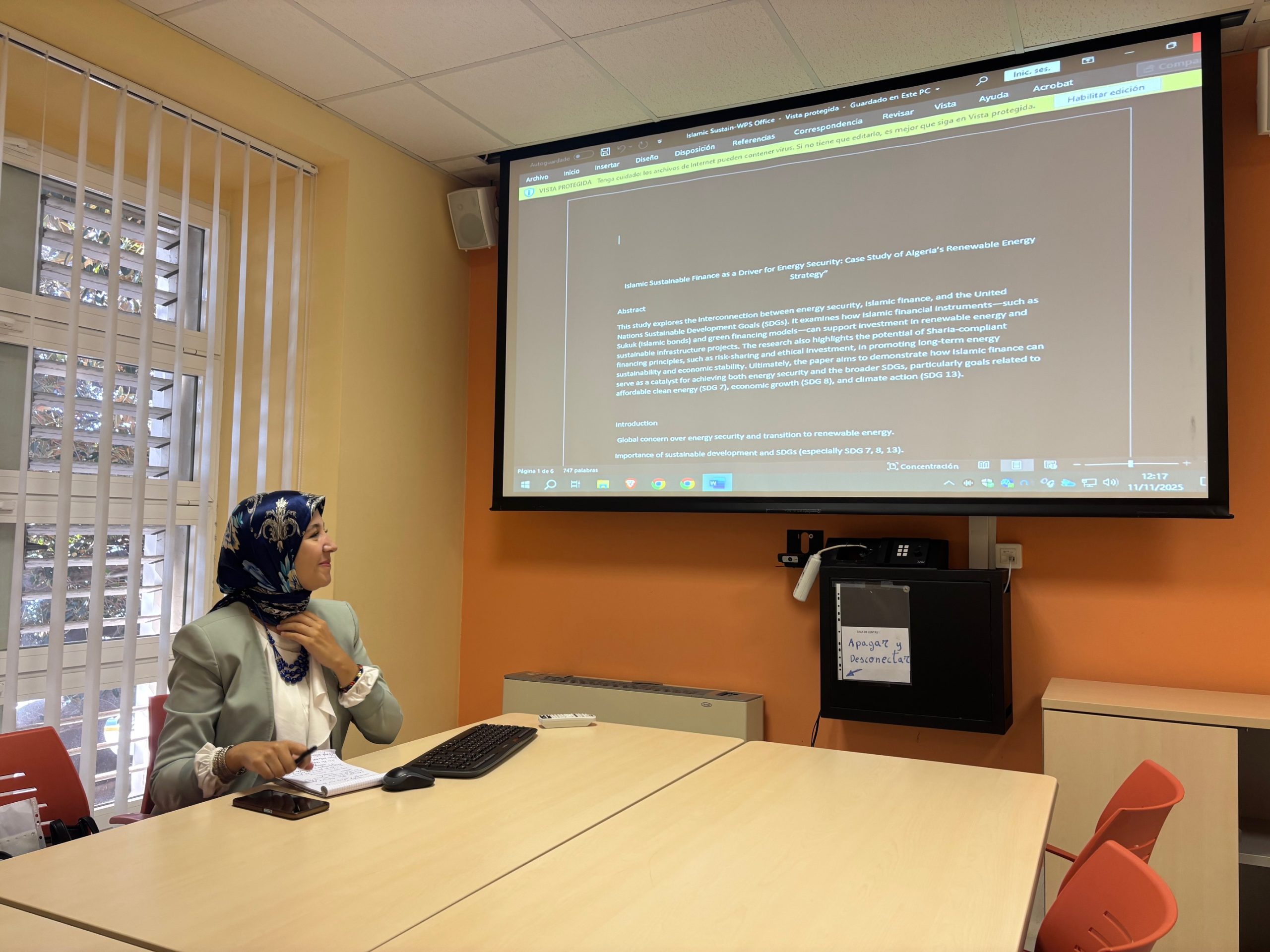 Durante su visita, la profesora Benazza compartió con alumnado y profesorado sus investigaciones sobre el modelo islámico aplicado a los seguros, las finanzas y el sector bancario, en el marco de un proyecto que busca su aplicación en energías renovables y sostenibilidad.